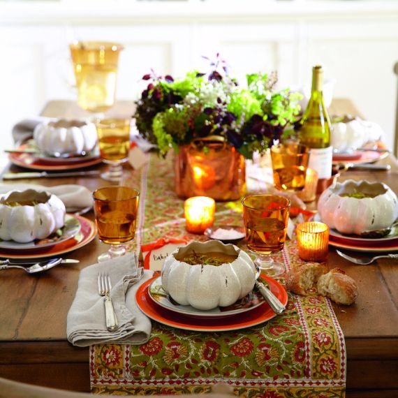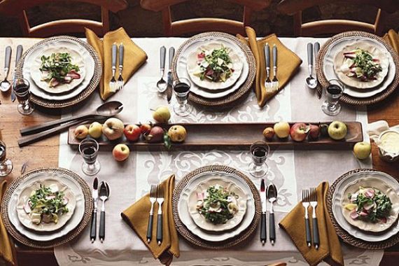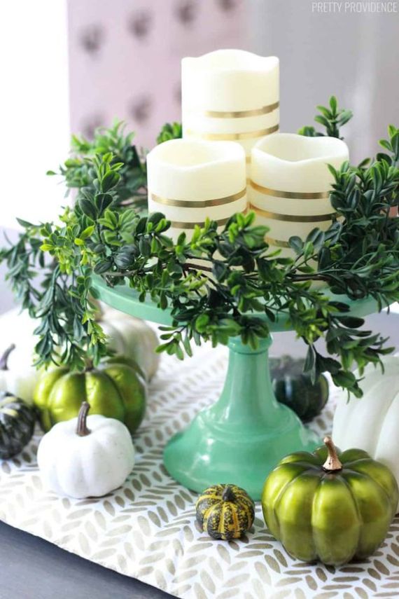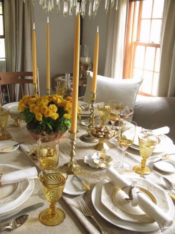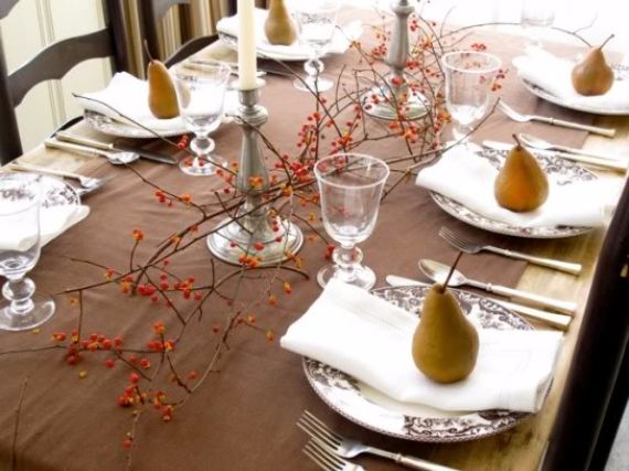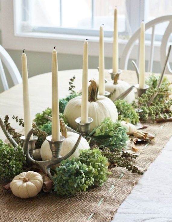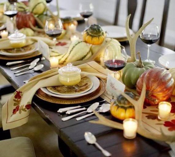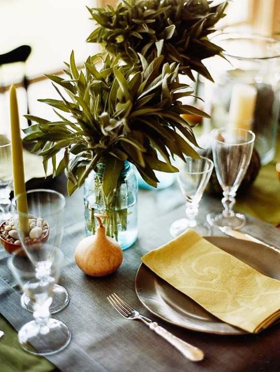 Green color is not a traditional every year color for Thanksgiving décor but why not use fresh greenies. You can use Green color in many necessary elements for such Thanksgiving table decor. Green elements may be tablecloths, napkins, table runners and candle-holders or/with branches, leaves, apples and other fruits and vegetables.