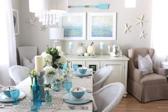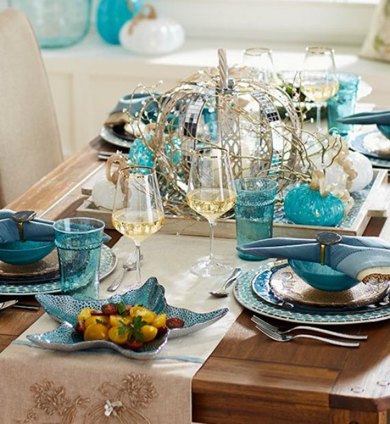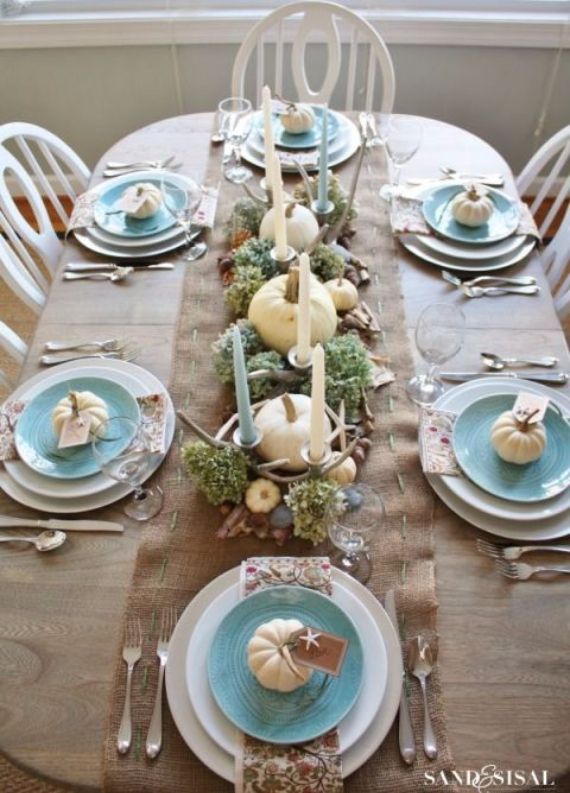 Celebrate Thanksgiving with saturated colors and sand hues for a coastal table decor. A seaside-themed Thanksgiving decor is an unexpected but a beautiful pick for the occasion. Consider a shimmery blue coastal and white color scheme Fall table decor with sea glass, seashells, glass pumpkins, and a macramé table runner to show off against colorful seaside tablecloths on your table. Blend aqueous colors that range from pale sea glass to deep greens and touches of silver to add a formal look. With sandy tones that come in many shades.