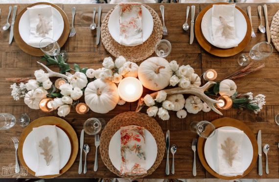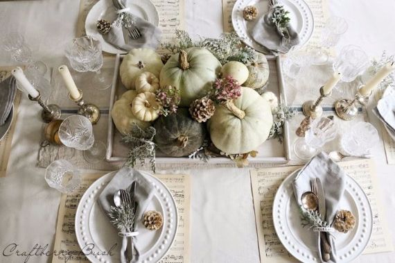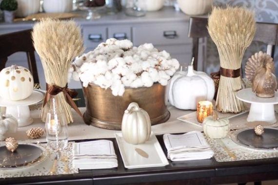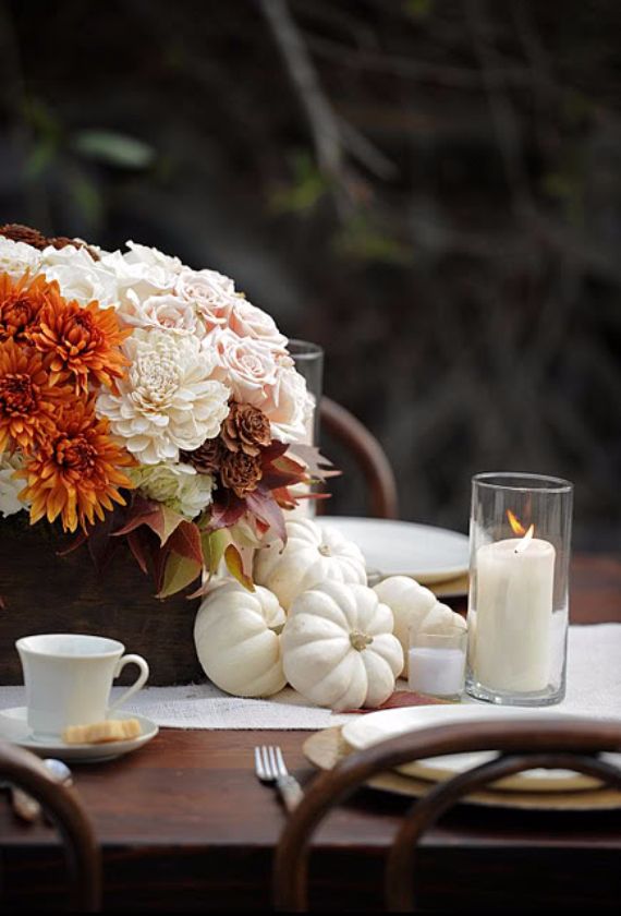 Bright whites Thanksgiving table setting can be a challenge. Although you can go mix & match different elements to come up with an elegant table setting, Bright Whites on itself is amazing. White roses and the white pumpkins as a long and skinny centerpiece to fill a lot of the length of the table can do all the job.