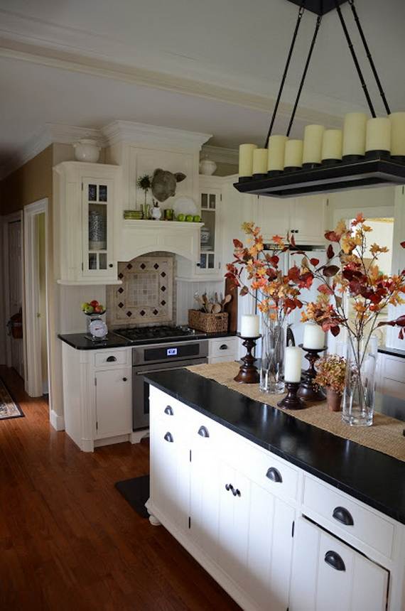 Get in the spirit of the fall season with some kitchen decor theme ideas using pretty fall rustic interiors by using chocolate brown and golden yellow to red fiery red colors of pumpkins, squashes, twigs, pine cones and bright leaves. These fall touches of kitchen decor theme ideas add a warm touch to your Kitchen Island.