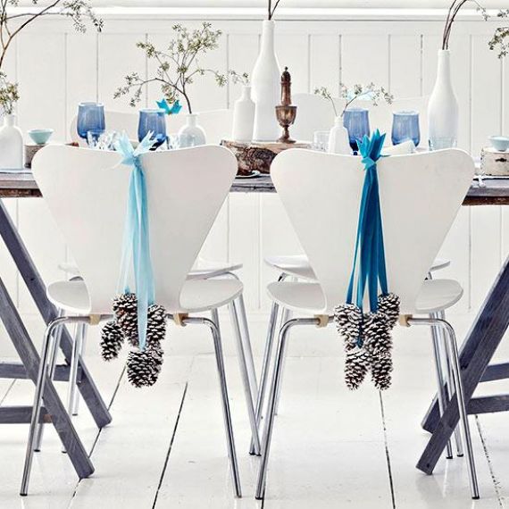 Dining room cheap Christmas decor pinecone Blue ribbons White chairs (vit terrysfabrics)