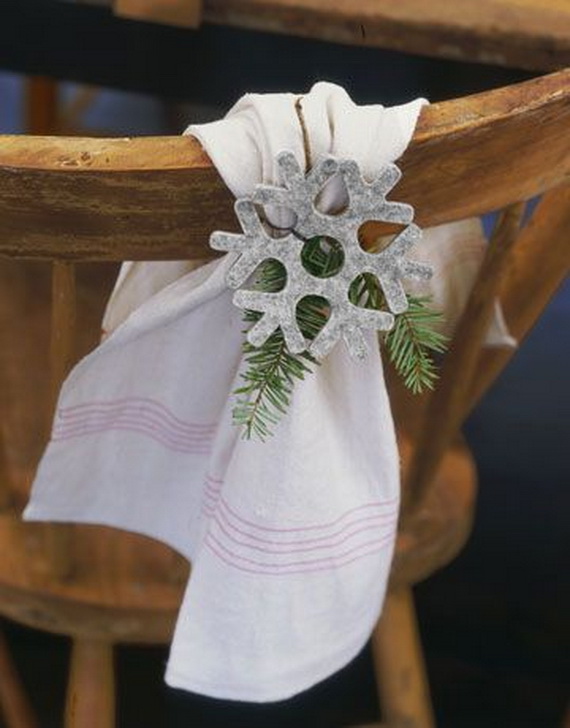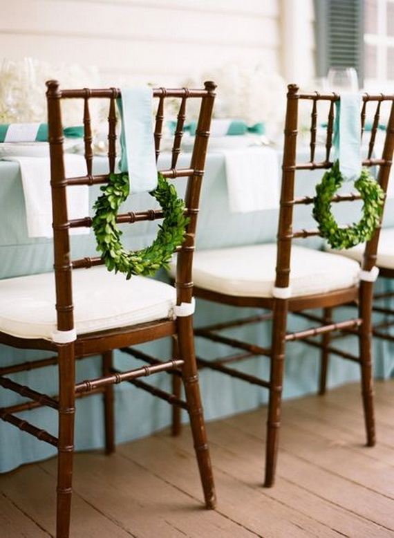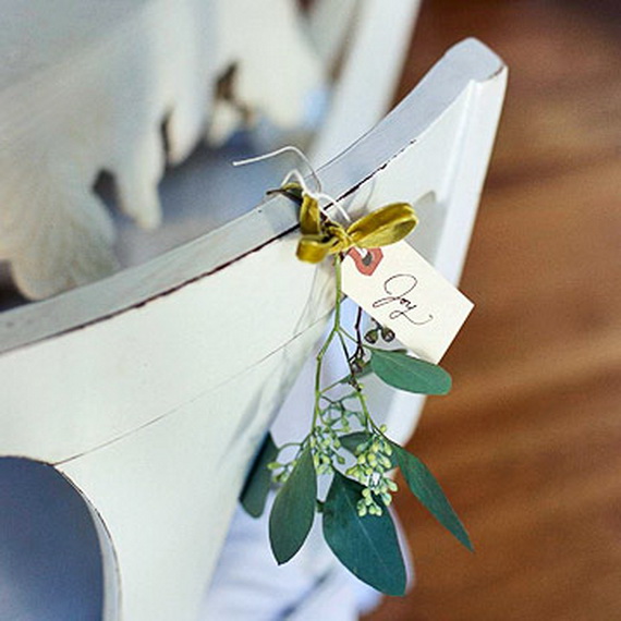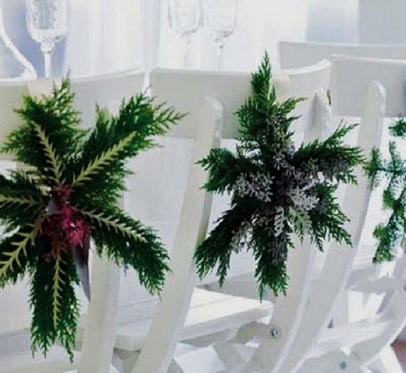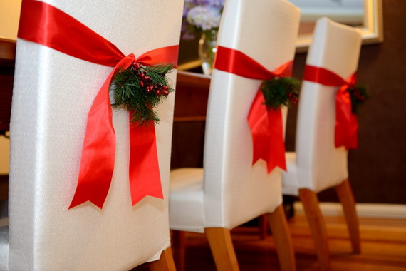 A nice way to decorate the chairs of the in simply without brains in the use of simple Christmas garlands on the back of the chair to reflect the beauty and appeal of the greeny nature. String them on a ribbon and tie to the chair back in a pretty bow.