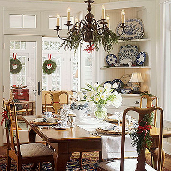 Wreaths are simple, yet elegant décor idea. It doesn’t need to be professional in manufacture or coated materials. Wreaths may be made from some green plants, Christmas bells, flowers, burlap ribbon, or shiny stain tapes in different colors… any wreath idea can be accomplished as long as it will match the Christmas festival décor of your dining room and details.