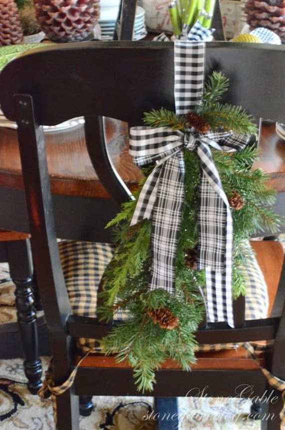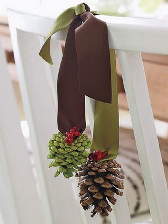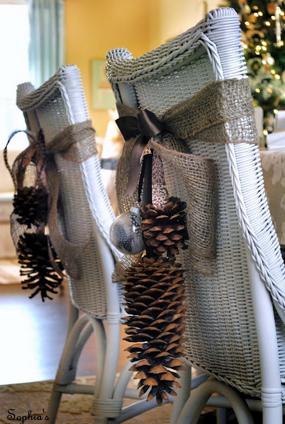 Bring the outside inside with the beautifully wooden colored of pine cones. Their natural forest beauty can add a beauty to the dining chairs. Pine cones with many colored hanged accessories like ornament chair swag or Christmas bells can be tied to the chairs by canvas tapes or a wide strip of burlap around the chair. For a special detail, you can fill the ornaments with feathers, pictures, or other small accents which can be available at home. Many new ways to decorate another piece of your furniture at home.