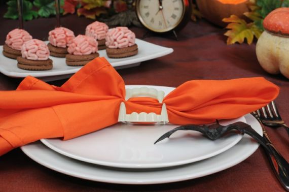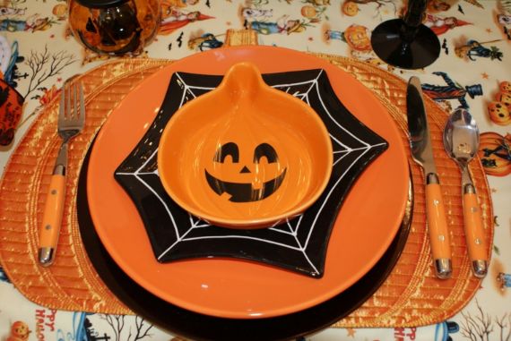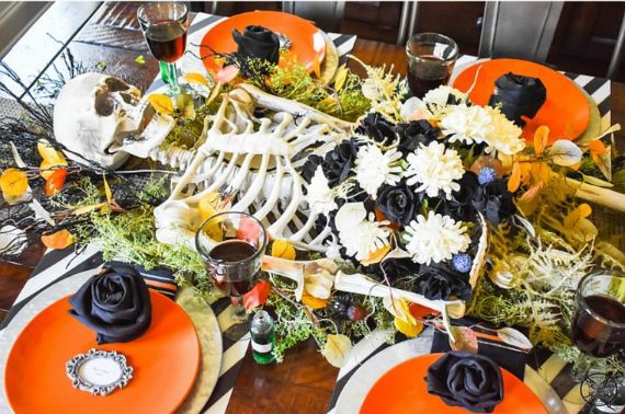 The traditional colors of Halloween are orange and black which never fail. Their combinations are absolutely perfect for your Halloween tabletop. Orange and black tableware, decor, and centerpieces add creepy and sophisticated Halloween vibe while the dining room remains elegant and classy. Of course, you can always give this dining table a much creepy look with custom pieces like drippy bloodstained candles, unidentifiable foods, brooding florals, skulls, few spiders and a few Halloween motifs.