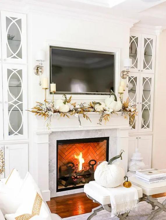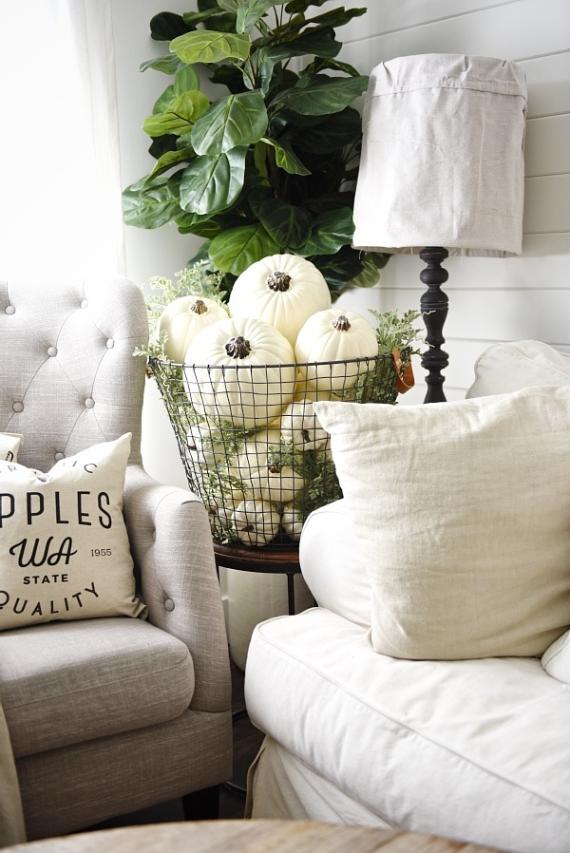 Orange, yellow, red, and brown are classic autumn colors, but choosing the white color as your main accent color can make your fall living room decor stand out even more.