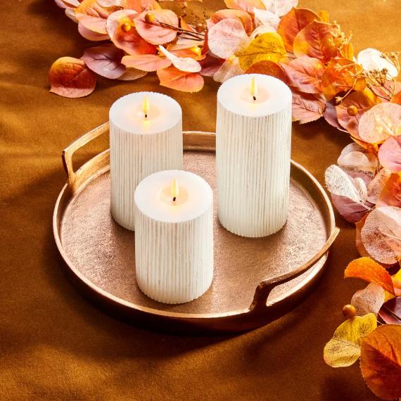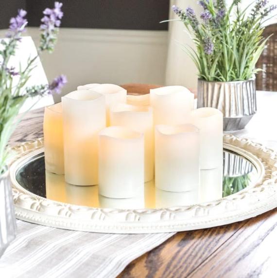 - Group pillar candles in a tray or platter in varying heights to display candles to create a layered effect.