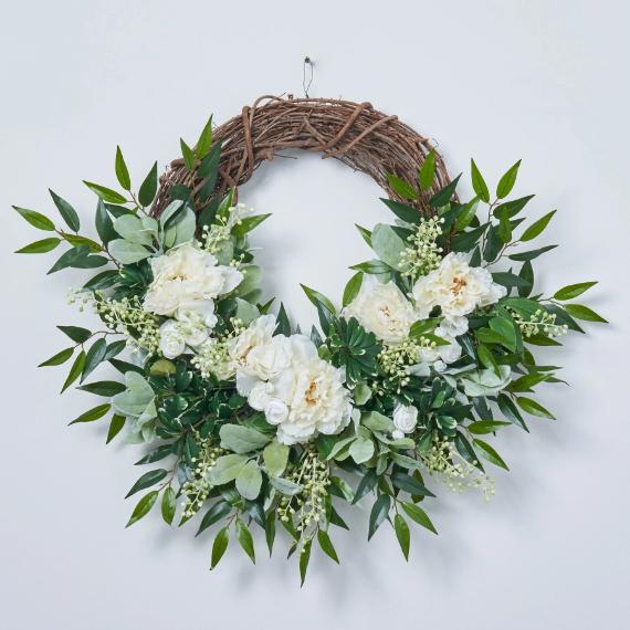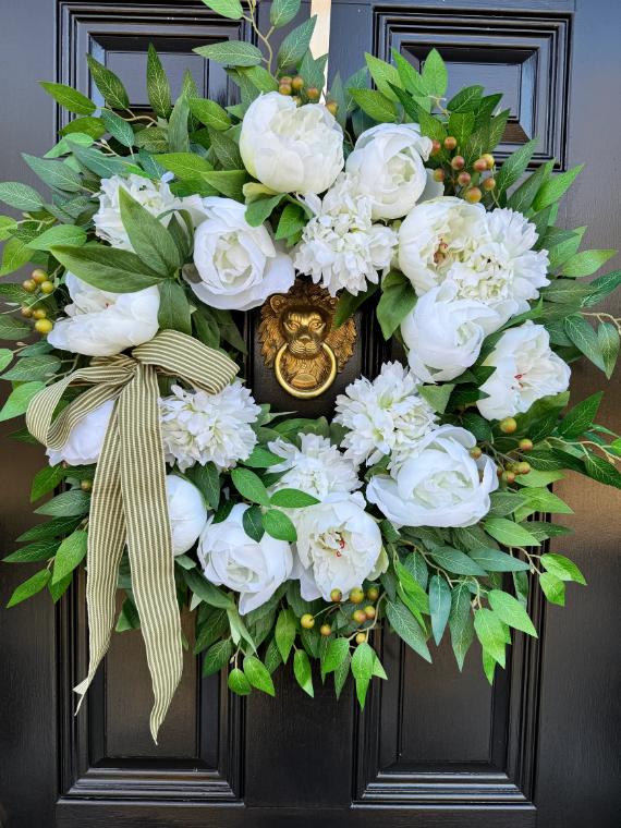 - Peonies wreath: Peonies are ideal for adding another classic floral arrangement as they are lush, large blooms and ageless that make a bold statement on any wreath.