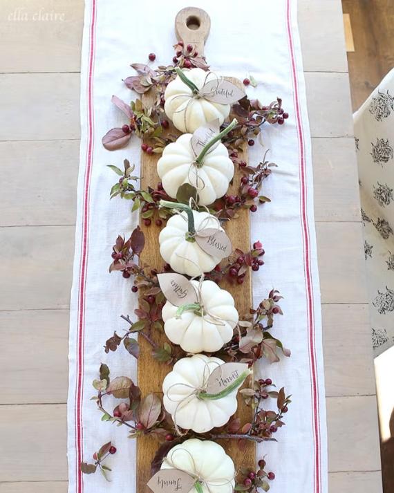 - Incorporate white pumpkins: you can incorporate white pumpkins in your decor this autumn. Use small white pumpkins as the base of your centerpiece, with natural elements like chasteberry sprigs, dried hydrangeas, and birch bark, either clustered together or spaced evenly along the table.
