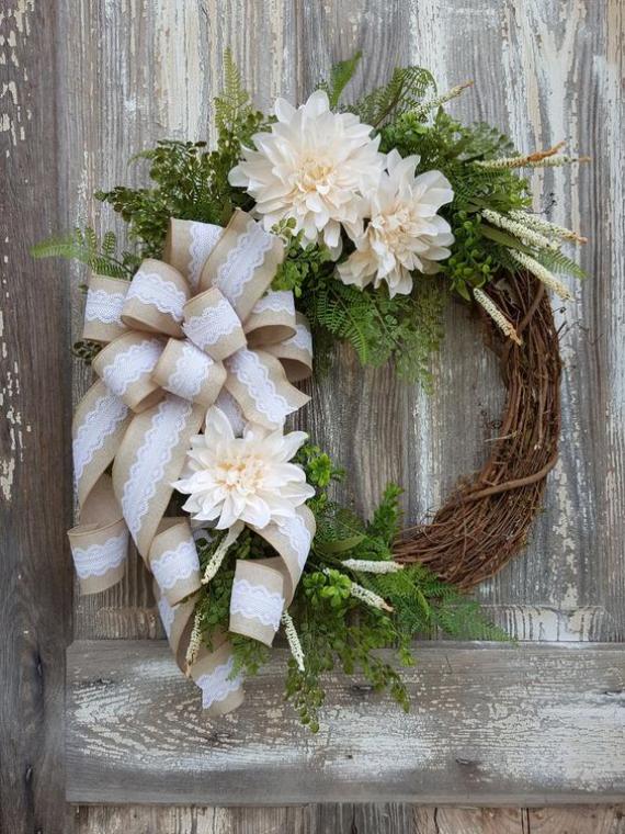 - White Dahlias wreath: These flowers offer intricate petal patterns that add a touch of farmhouse charm to your entrance, with this vibrant fall wreath you can enjoy the entire autumn season.