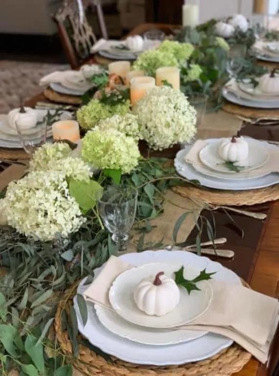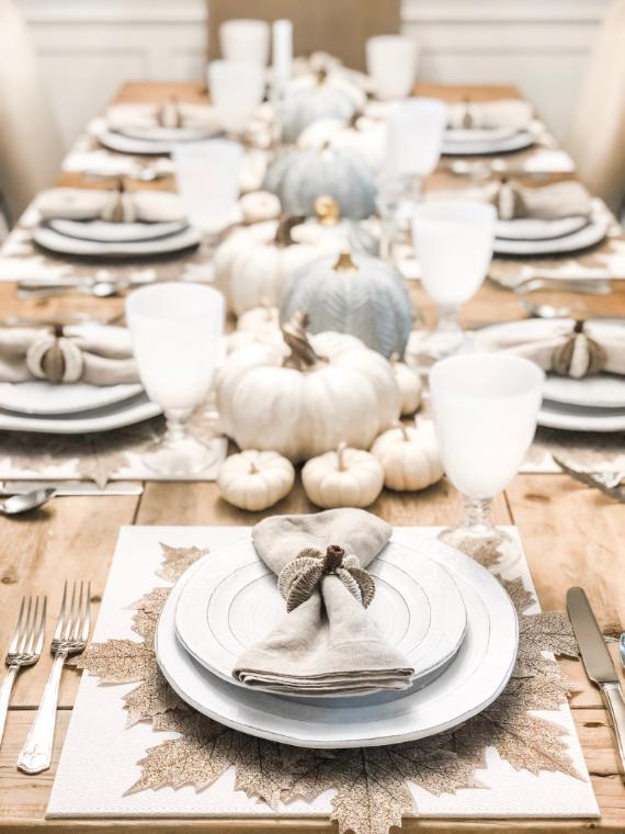 - Incorporate seasonal elements: Add touches of autumn with decorative pieces like white pumpkins, gourds, or acorns soft colors, neutral everything, scattered across the table. White color offers the flexibility to be styled differently throughout the year.
