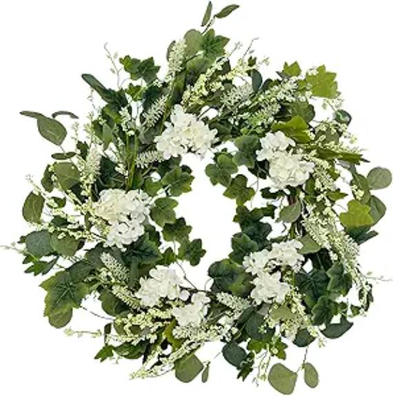 - White Hydrangea Wreath: generally, hydrangeas symbolize heartfelt emotion of boasting and bragging as well as grace and purity. Hydrangeas are full of abundance and lushness, round large clusters that add a romantic and charming touch to any wreath.