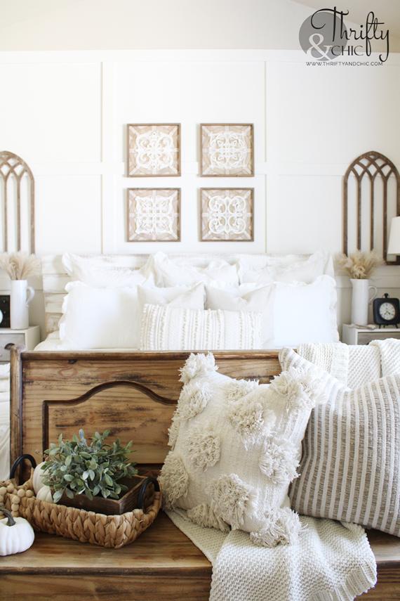 Using Fall Accents can easily change a White Bedroom into whatever you want in almost no time.