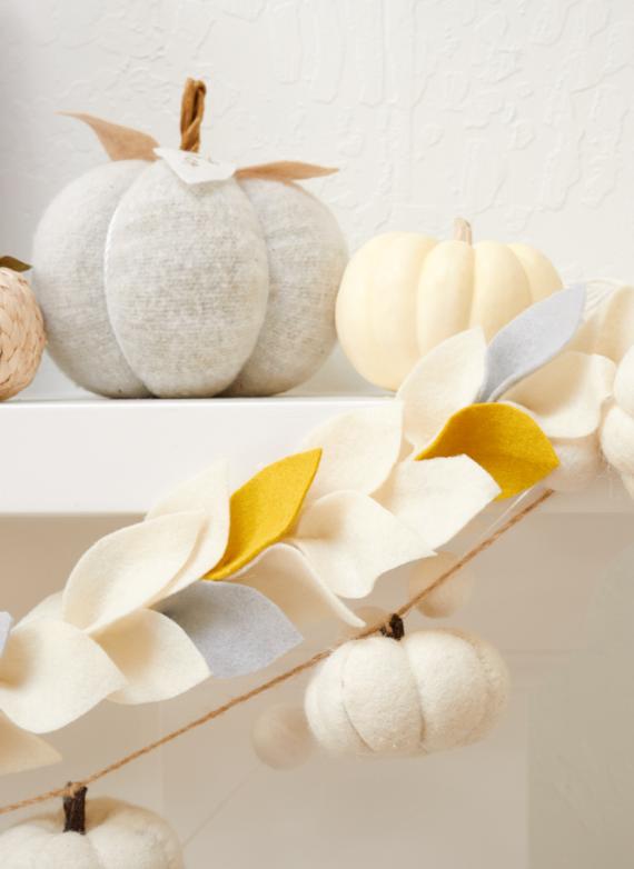 - Felt Leaf Garland: String together white felt leaves and pom-poms to create a festive garland perfect for draping over a mantel or window for an inviting and a cozy look.
