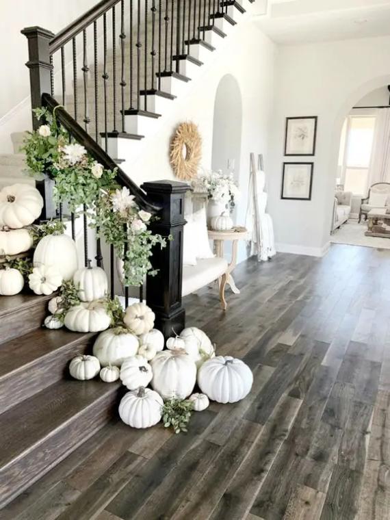 - Mix with Greenery: Place white pumpkins and gourds on your porch or patio down both sides with a touch of green like eucalyptus or ivy.