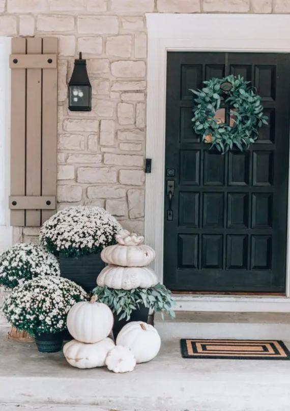This year start to create a fall front porch “white-out” instead making your space saturated with all colors of the season. Instead create an amazing white fall décor idea outdoor. Have a different look for the front door and porch.