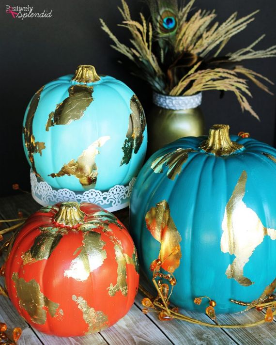 Gold foil on pumpkins are not the only metallic foil color used, but you can use nontraditional colors — blue, aqua, purple and gray — on a base painted gold foil pumpkin. Gold foil pumpkins will look lush and elegant on mantles, on the front steps or at any place around the house as they match my seasonal décor.