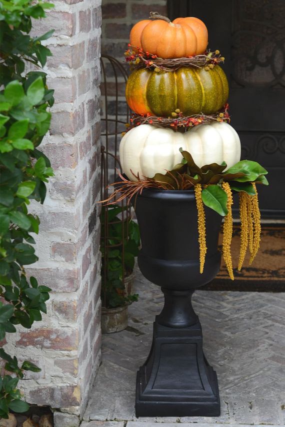 Pumpkin topiary creates elegant entry. Pumpkin topiary may take a Halloween version or a Fall version both are pretty pumpkin décor display for home fall décor. DIY pumpkin topiary are easy to create by using different shapes and colors of pumpkins.