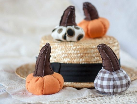 Craft adorable fabric pumpkins using orange circles (faux fur, felt, fleece). Sew stitches along the fabric’s edge. Fill a small bag with stuffing (cotton wool, foam, fabric). Place the bag in the fabric center, gather edges with thread, insert a small stick, and tie. These easy pumpkins are perfect for Halloween and thanksgiving crafts or charming autumn décor.