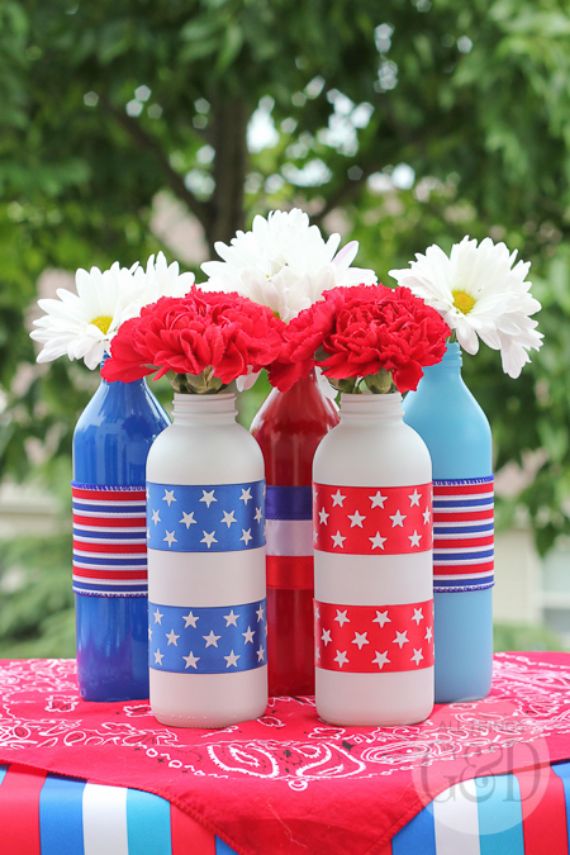 An easy, low-cost way to add some red, white, and blue patriotic centerpieces. These patriotic painted glass bottles with ribbon or fabric ties are made from recycling jars with spray paint for the 4th of July holiday, results in a stunning centerpiece.