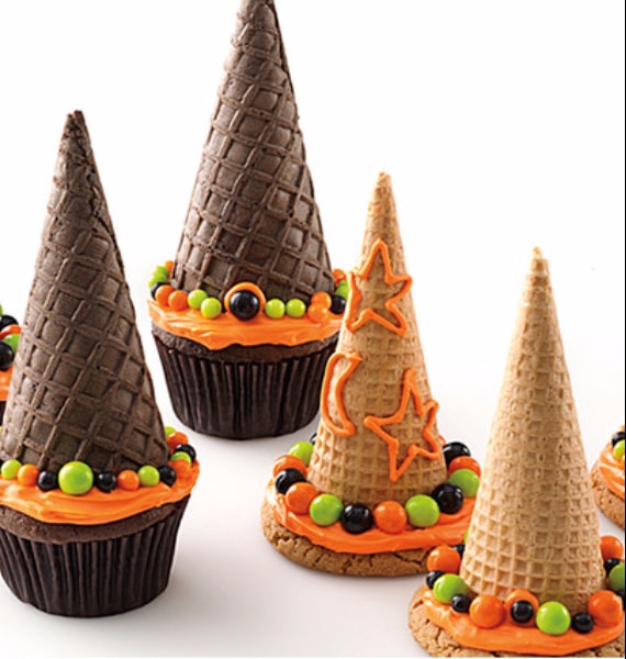 Witch hat are wacky Halloween treats and adorable and easy to make. Tasty little witch hat cookies, witches hat cupcakes and candy snacks all are easy enough that my kids can make them.