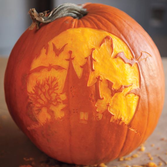 • Carve a silhouette. It is a simple alternative to the classic jack-o-lantern face; Generally speaking, it is easier to make because there is less fine cutting. Pick a shape and you cut out the background the “negative space” around the character, then carve out features like eyes or a mouth to make the character look back lit Keep in mind you don’t cut all the way through the wall of the pumpkin! Only cut the design to a depth of about 5mm for a two-toned multi-dimensional effect. You’ll end up with a rounded circle of light much like the Moon around the dark shape, with lighted details left out. On a dark night the candle light ray will peek through the shallow portion for a really nice effect of the Halloween carved pumpkins designs.