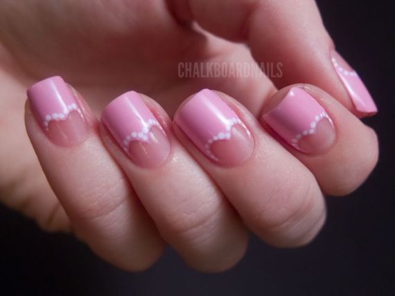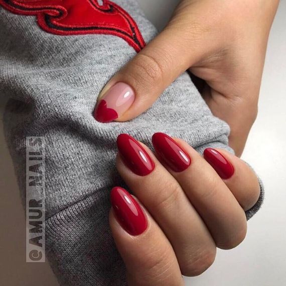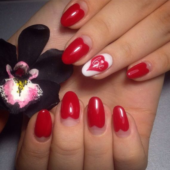 At all times and on all holidays, the classic coat or moon design (holiday moon phase, half-moon, French moon) never goes out of style. It is enough to simply decorate the red French manicure with the help of certain tools or stickers to create such a design to create a thematic design. But you can go further and make a jacket in the shape of a heart. It is very easy to carry out, it is enough to outline the borders using a clean brush to create small dots, after they dry you can then apply a varnish along the border of the picture with a standard brush (while part of the nail remains exposed).