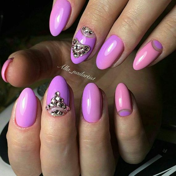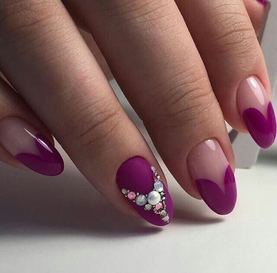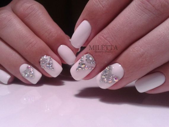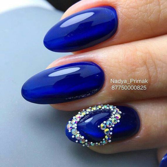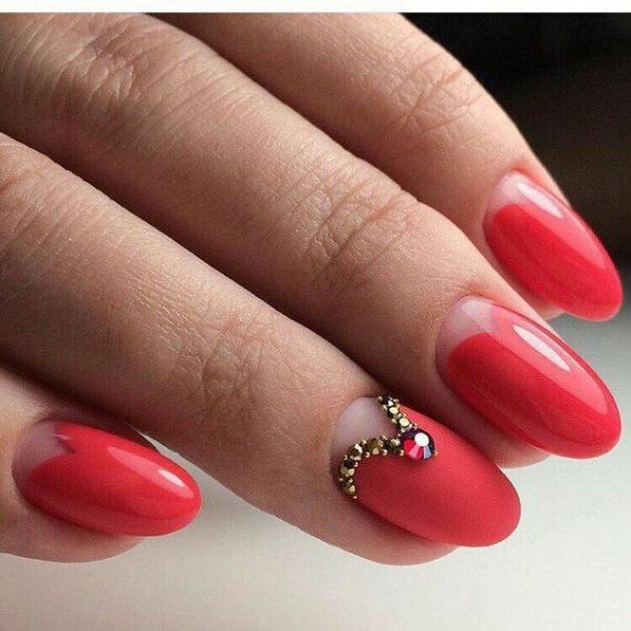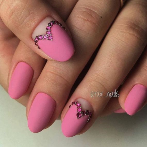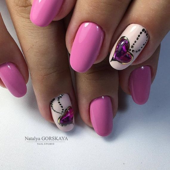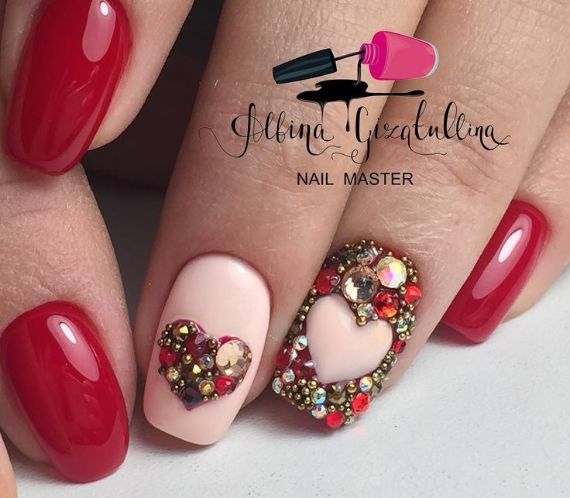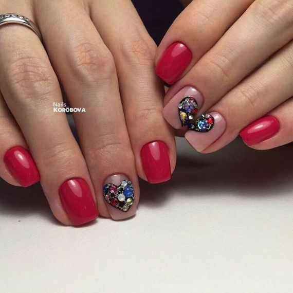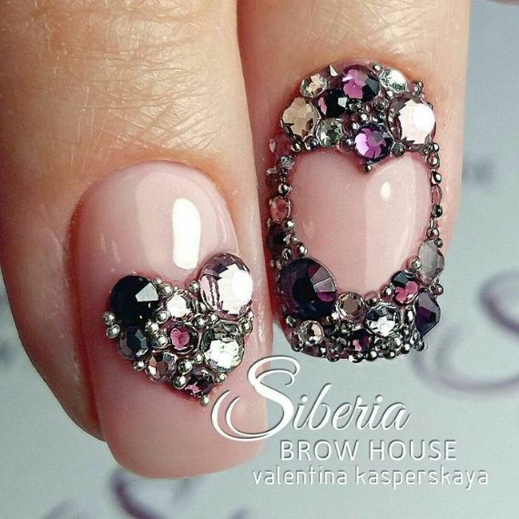 There are many other options for decorating nails besides stickers; inlay is one of them. An inlay in the shape of a heart made of rhinestones or metal rivets for nail design on the ring finger nail is new holiday symbol. Either you quickly lay them out or you can find rhinestones and nail jewelry made immediately in the shape of a heart in online stores.