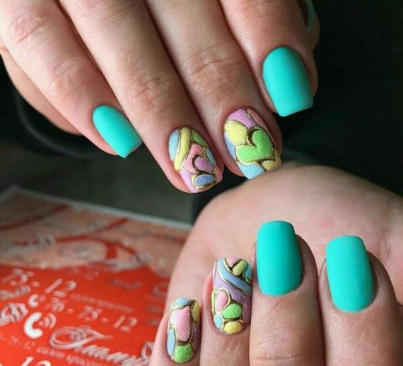 Now it is fashionable to make three-dimensional designs using broken stained-glass pieces, foil, rubbing, covered with a top layer or stained-glass varnish. Although these ideas seem difficult as they require a special set of tools and equipment, turning your nail designs into gorgeous piece of art is really quite simple. On Valentine’s Day, you can create a heart shape in the form of a pendant on one nail.