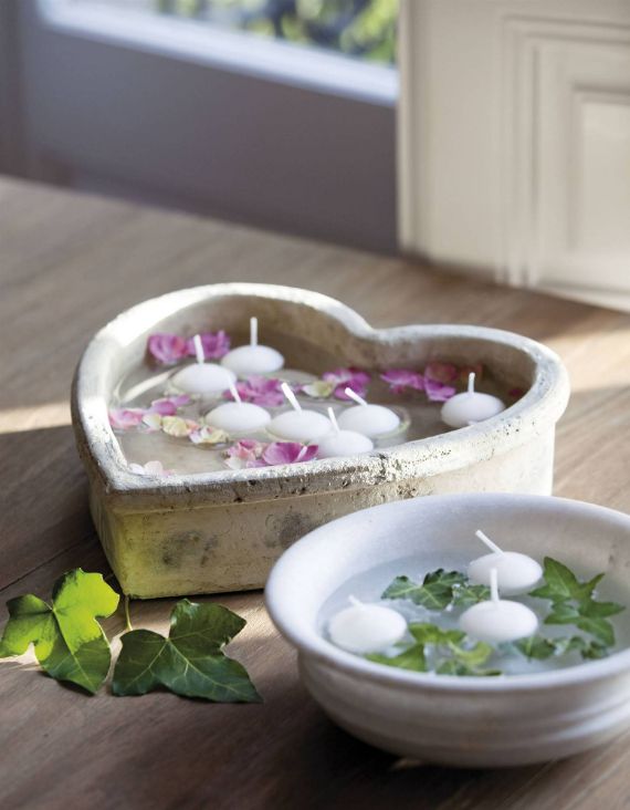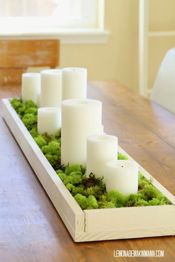 Make a small arrangement of white candles placed together in a tray, fresh leaves, aromatic plants and paired up with green moss bedding. For the final touch use ribbons to add a more designer look to the candles.