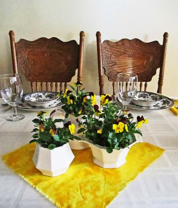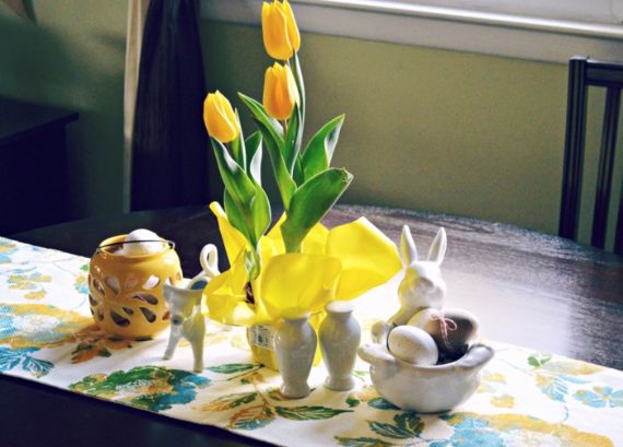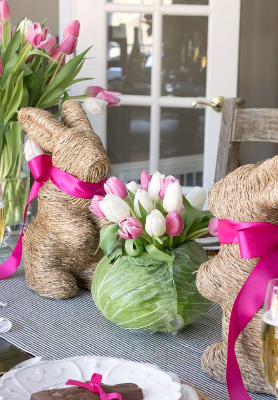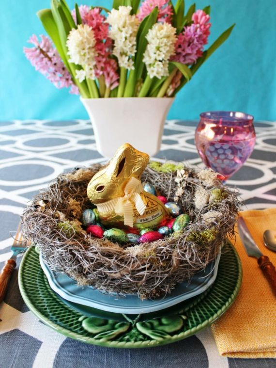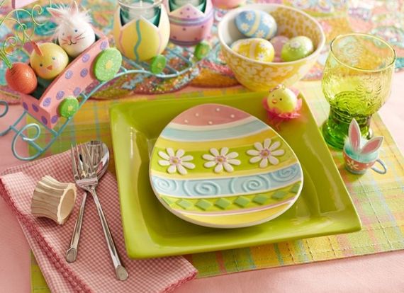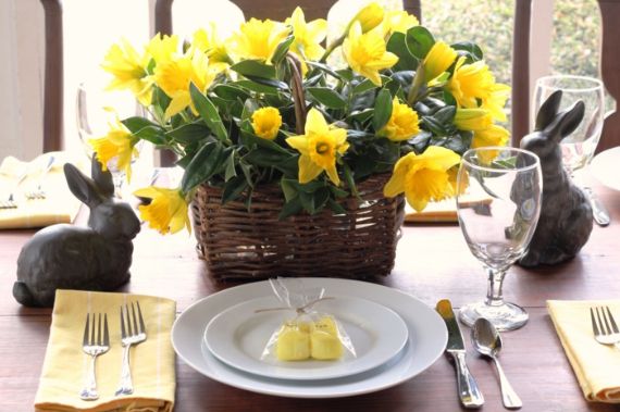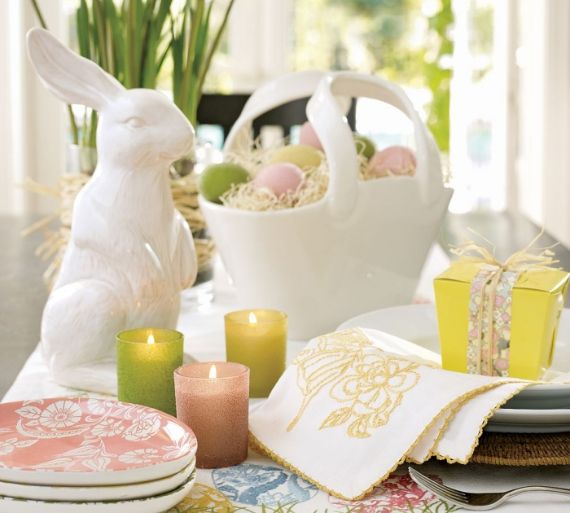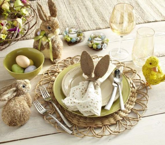 In addition, the Easter table can be decorated with unobtrusive with Easter decorative figurines…Cute little chickens or bunnies near each plate, a small wreath in each plate or on the back of the chairs and even one big Easter rabbits will look appropriate, joyful and very festive.