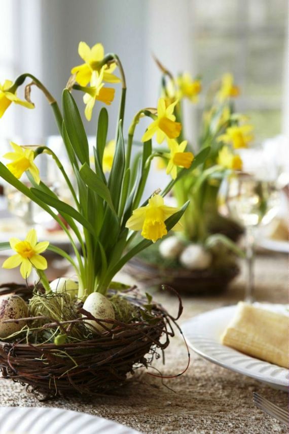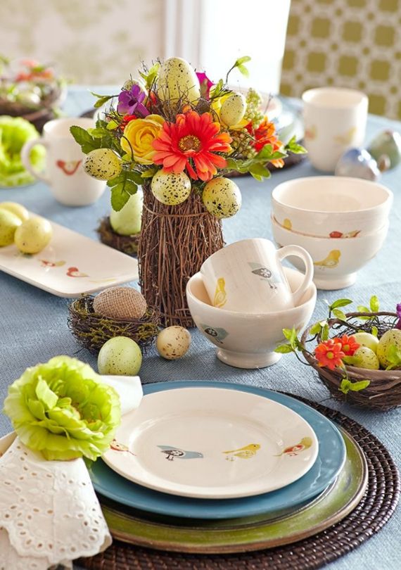 Tasteful Decorating Ideas For Your Festive Easter Table setting…Textiles, eggs, Willow flowers and twigs, Easter bunnies and birds, nests and other miniature compositions with table decorations for Easter table setting.