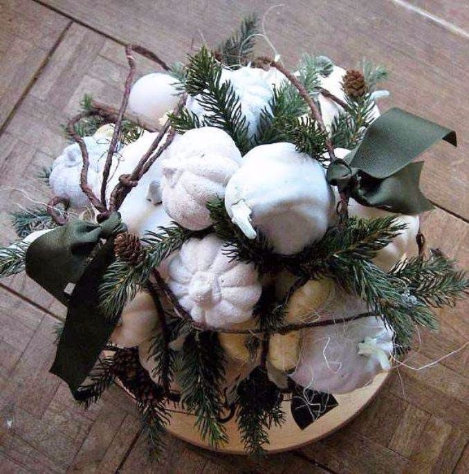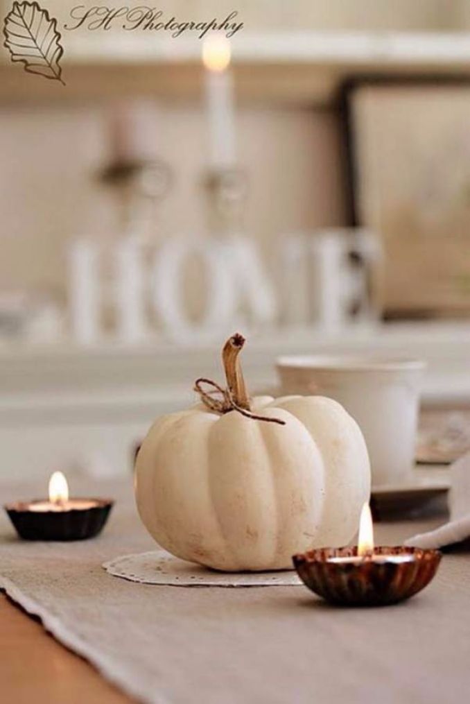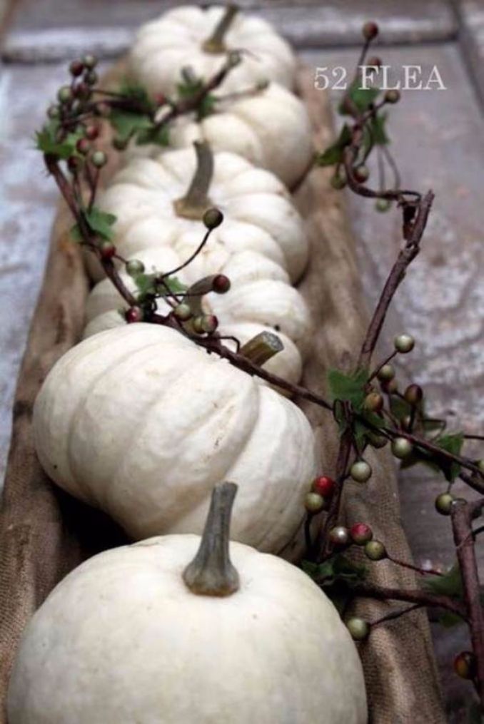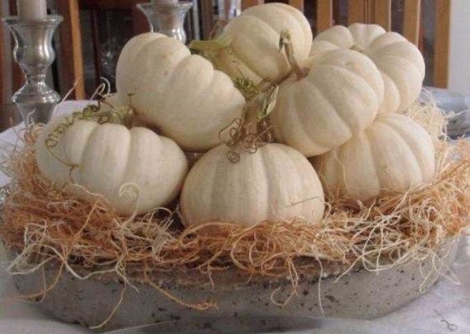 White Pumpkin Centerpiece mixed as decorative pieces with other rustic elements can create a Rustic Chic White Pumpkin Table Centerpiece for fall. They can be mixed with other color palette of cream, sage green, and tan to make the table more appealing.