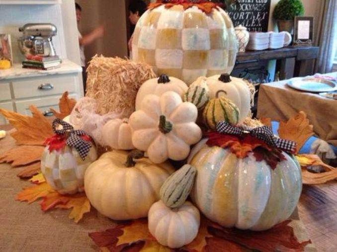 A mix of colored pumpkins and group arrangements of similar colors and sizes whether painted, carved pumpkins or etched pumpkins will warm up your fall table and will be very inviting in the middle.
