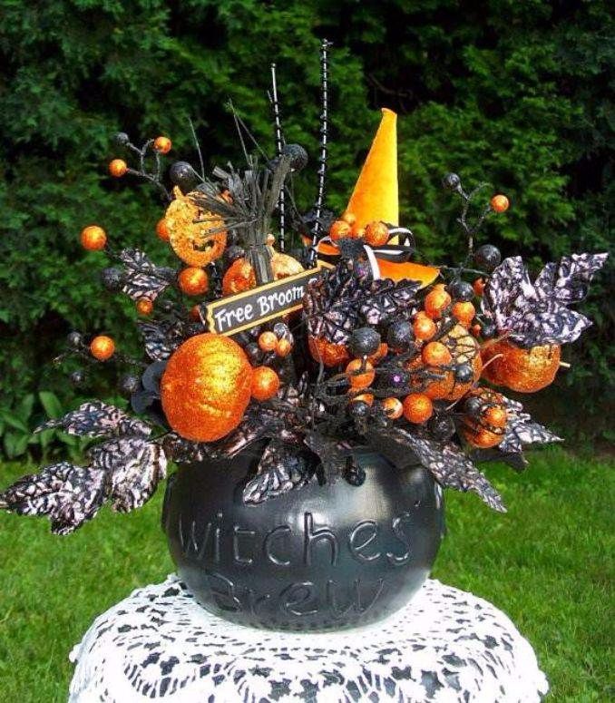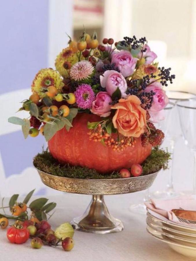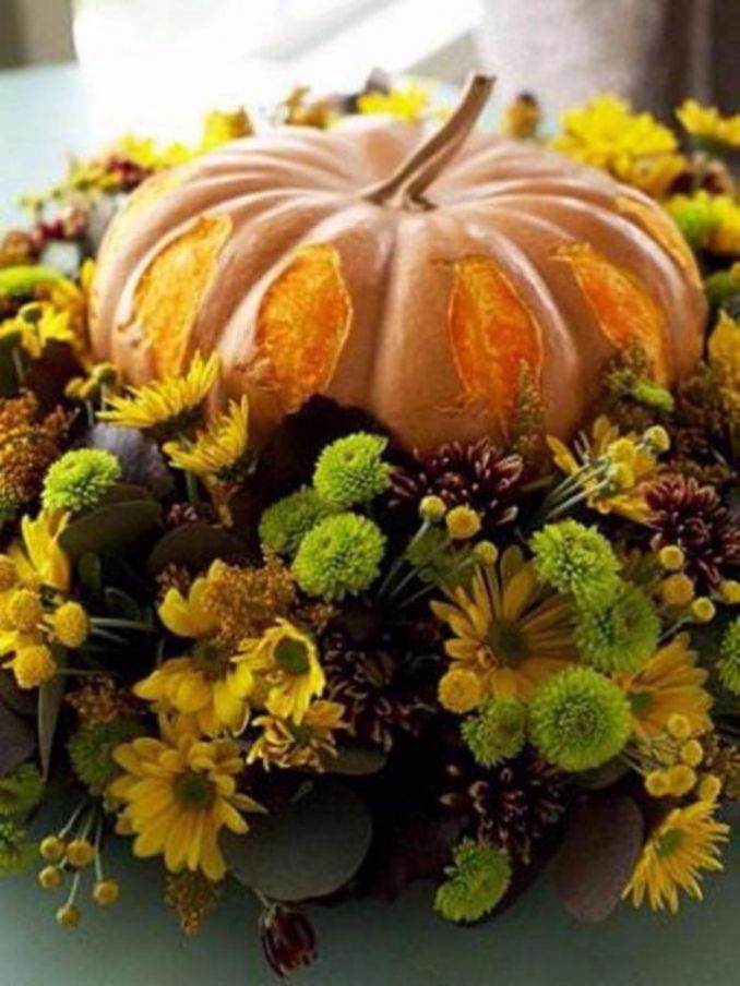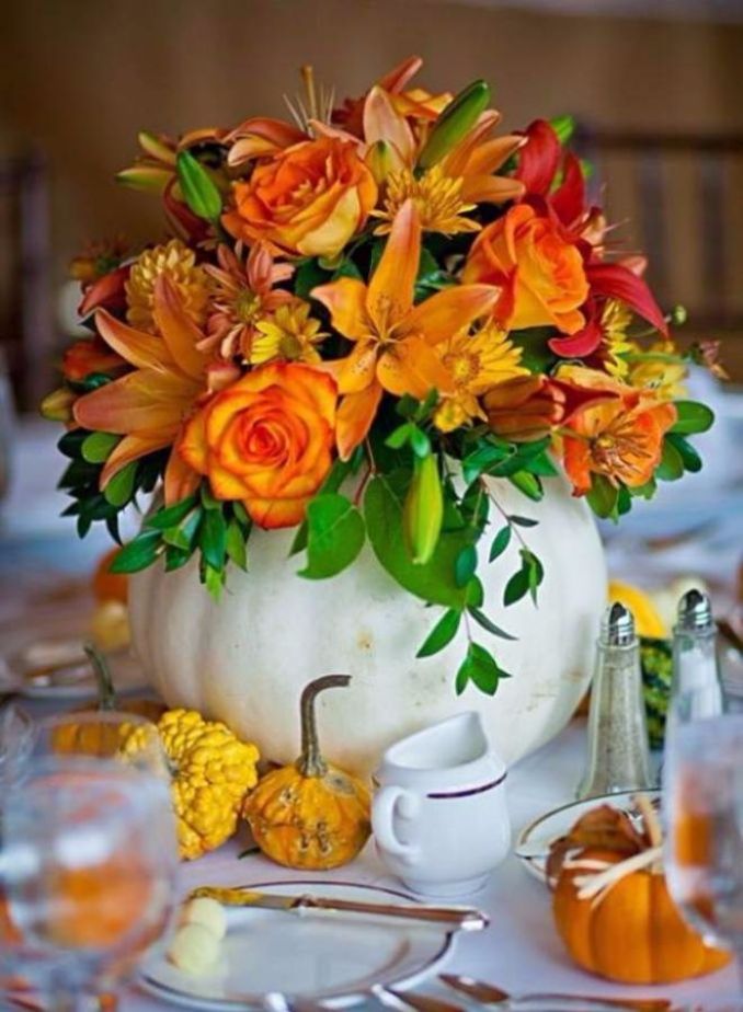A traditional variant is a pumpkin vases centerpiece with flowers inside. You can use a real one or a fake one. If a natural one is used, here you cut the pumpkin inside to make a hole and transform it into a bowel to serve as a vase where flowers are arranged inside.