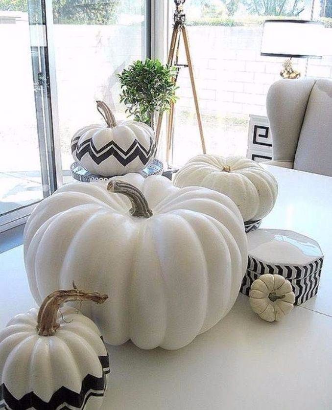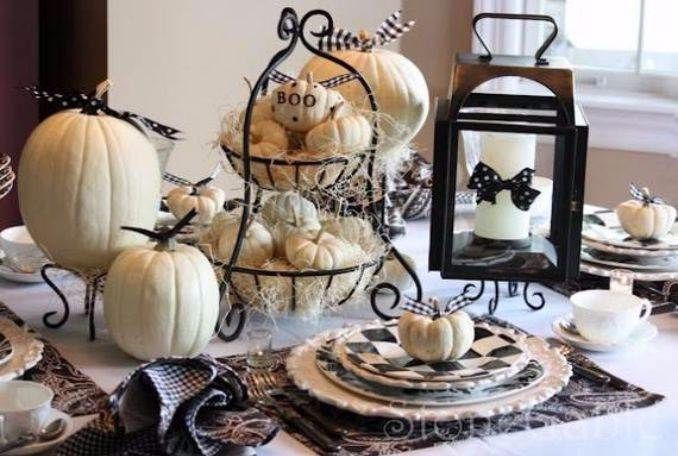 A black-and-white pumpkin centerpiece color scheme gives a magic display. The white color can be added beside the orange pumpkin on any decorating table and pops against fall’s bright oranges too.