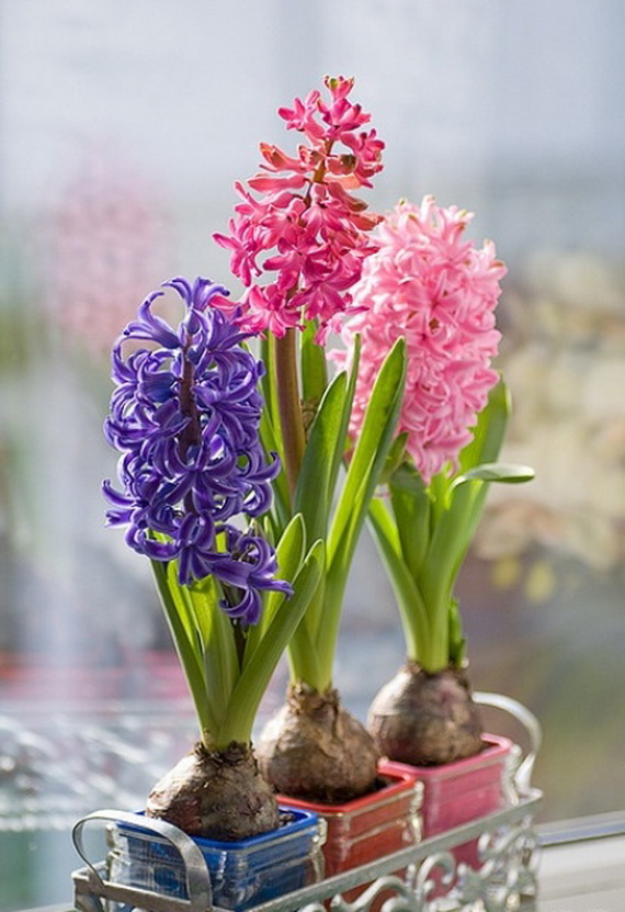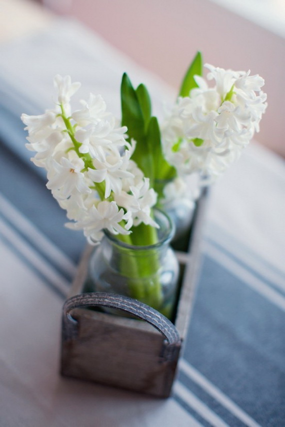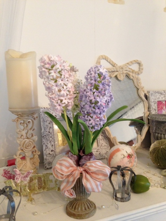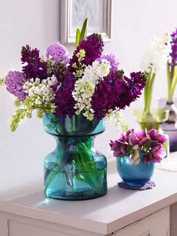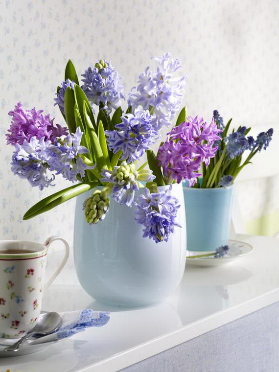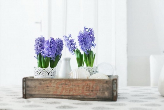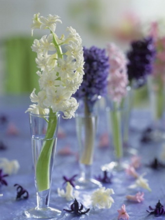 The hyacinth is a fabulous spring flower ideal for a spring centerpiece, any table or party would be greatly decorated with them! Their delicate colors bring spring atmosphere into your home and shine with elegance spring colors. Hyacinth brings spring from outside into inside and used for the interior as decoration for the coming Easter and spring. Check out these wonderful ideas from wunderweb and get inspired by the colorful spring blossoms on how to use the hyacinth as a spring decoration.