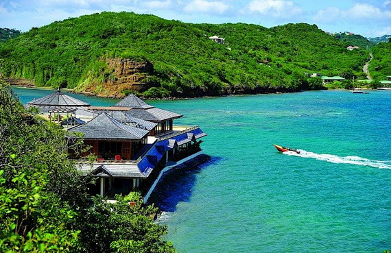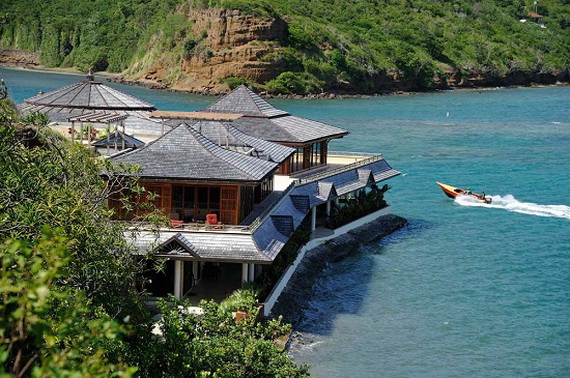 This island was once part of the Grenadian heritage. It was purchased in 2000 by a French businessman and his wife (Georges and Martine Cohen), who subsequently built a sprawling residential compound of made Two Balinese and French Colonial-inspired residences and three custom designed luxury cottages. Initially, the Cohens conceived Calivigny as a family retreat and private getaway and they have recently decided to “charter” the island. These three inspiring living atmospheres:The “Beach House Résidence”, The largest an architectural masterpiece, harmoniously blending French Colonial and Balinese style, It comprises a grand salon, a dining room and 10 sumptuous suites and incredible views.The spectacular modern “Overhang Residence” offers an additional nine fabulous suites in six bungalows with a breathtaking terrace with panoramic views. The “Calivigny Cottages”, three deluxe two bed-room villas all claim with private outdoor Jacuzzi provide an intimate setting for those precious moments. They provide accommodation for up to 50 guests on 140,000 square feet of living space with six sandy beaches and sweeping views of the Atlantic and Caribbean oceans. Picture source.