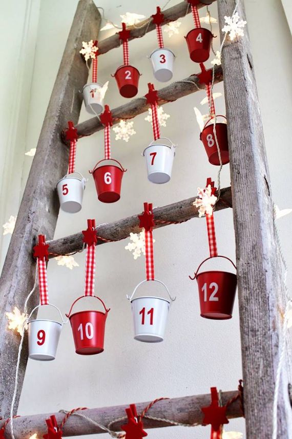 Building the ladder is pretty quick and easy, however, making the decorative ladder as an advent can be used year after year. To get started you’ll need a ladder with 25 mini harmonious set. This mini harmonious set is made of white and red cubes and hanged with decorative ribbons. To make the set look more harmonious, light garland with snowflakes have been enough to shape this original advent calendar. Via Pinterest