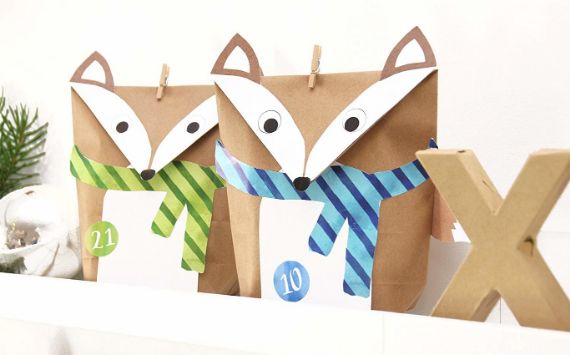 The advent calendar is for the little ones. Gather 24 brown paper grocery bags, fox heads, -bodies and -tails printed on cardboard and stickers with the days of the month. Cut and glue.
