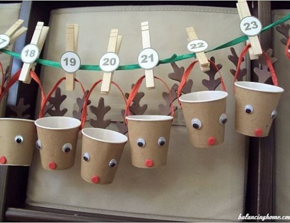 The reindeer advent calendar is another fun option that you can make using disposable cardboard cups. Theses cute reindeers in cardboard cups are made of Eva rubber, clothespins, eyes and hang the reindeers on a rope.