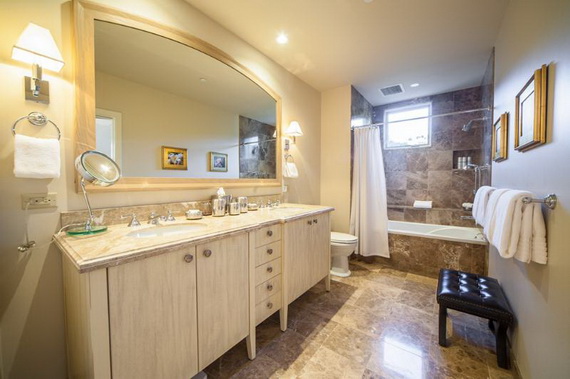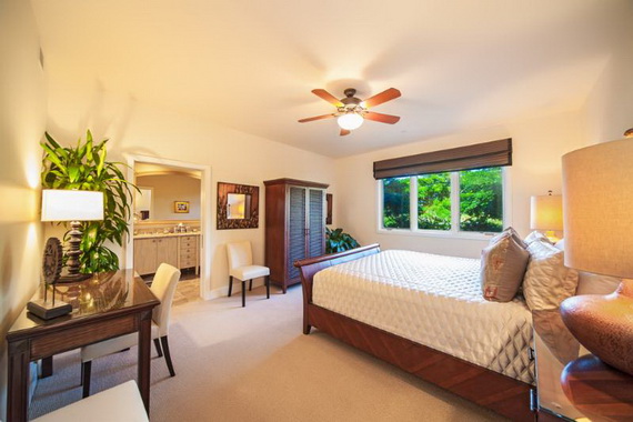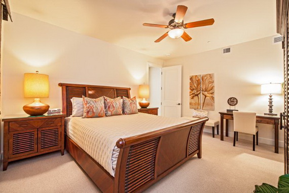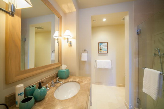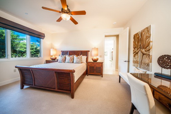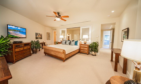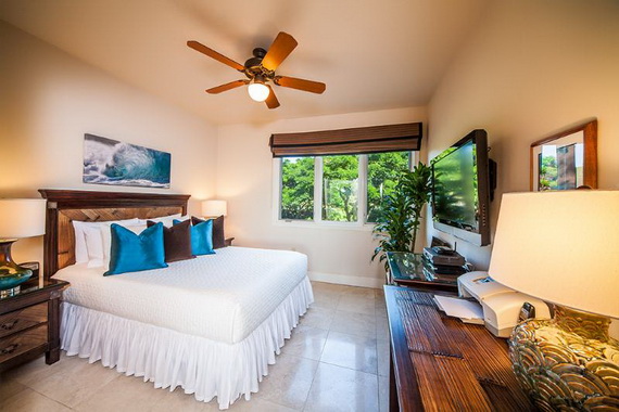 The villa has four bed rooms. First bedroom offers king bed, woven window coverings, carpeted floor, TV and desk. The room has garden and Mountain View, Ensuit bathroom with a shower, double vanity sinks, WC, make up mirror and hair dryer. Also it contains central Air Conditioning, DVD player and ceiling fan. About the second room, it contains king bed, side chair, side tables, woven window with an ocean view, carpeted floor and dresser. Also it has a bathroom with full luxury private en-suite bath with separate deep soaking tub and separate glass shower. About electronics of this room it offers large HD flat panel TV, DVD and other devices. The third bedroom occupied by King Bed, window blinds, pure silk light blocking drapes, desk, side chair, TV armoire and dresser. The room has garden exterior entry area view. Also it has a hall bath with shower, vanity, WC and linen closet. The fourth and last bedroom offers a queen bed and all entertainments like the other rooms.