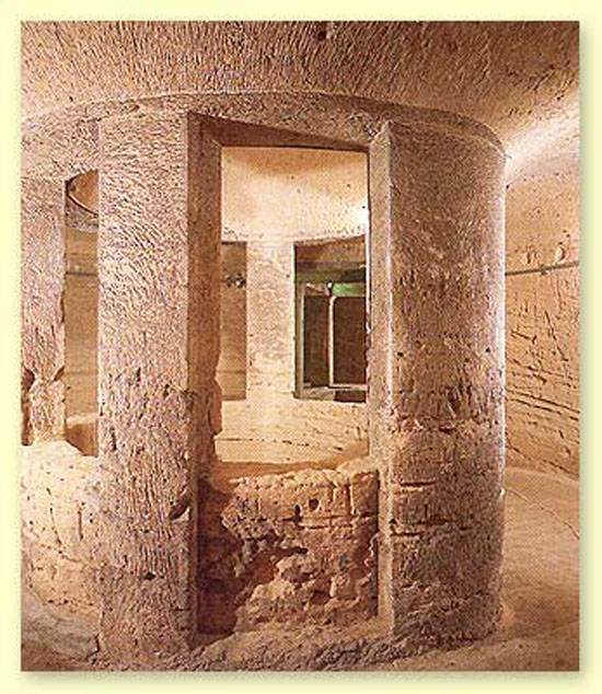 The Catacombs of Kom el Shoqafa are a subterranean funeral complex were first carved into bedrock! by a wealthy single family who still practiced the old pagan religion as a funerary site .Considering they were built the late first century AD (the age of the Antonine emperors ) with subsequent generations it was expanded in the 4th century AD and used as an active burial ground by adding corridors and floors This could explain why so many chambers were hewn from the rock. and not much is known about how the underground complex came eventually to include in its final stage over one hundred loculi and numerous rock-cut sarcophagus tombs.