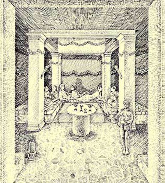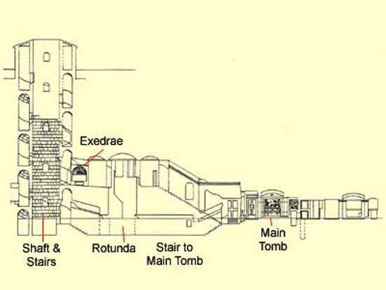 The first subterranean floor consists of a vestibule with a double exedra, a rotunda (circular hall with dome), rooms include a the triclinium or banquet hall that contained tableware when it was first discovered,with 3 benches where friends and family of the deceased ones used to feast, a vestibule, an antechamber and the burial chambers with sarcophagi carved in stone. At the center of the spiraling staircase is the shaft through which the bodies were lowered for burial.