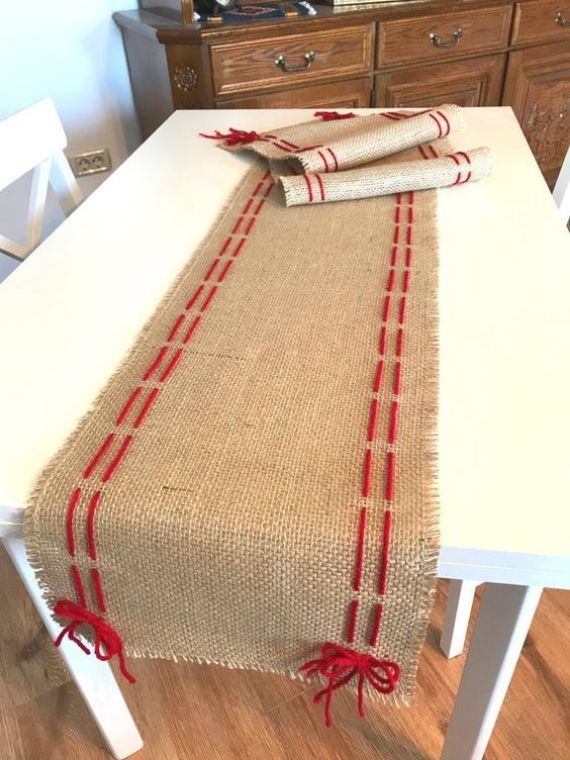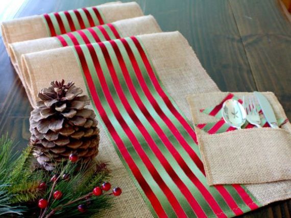 Christmas table runner, unique holiday decor to decorate your table, but basic sewing skills is needed. It is made of natural burlap and any kind of decoration in the middle for a festive theme. The burlap Christmas table runners can be such a Christmas classic or go for a chic velvet strip or something shimmery to last you through the new year.