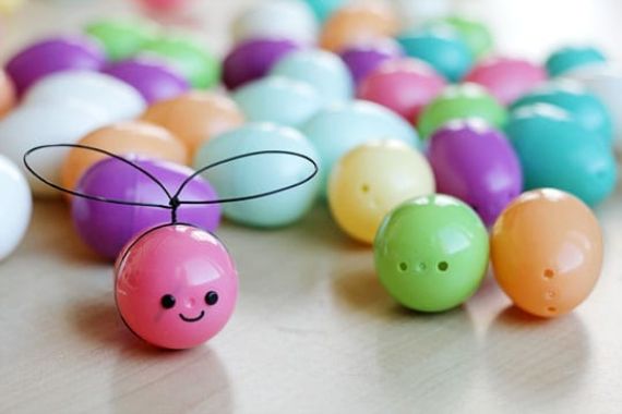 How cute are these little Pastel colored bumblebees. These little bees with big eyes and cute smiles are very simple to make. All you need is a plastic egg that has two holes on either side, black brads, black wire and black paint pen. And from Tried & True you can get the full instructions.