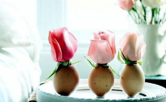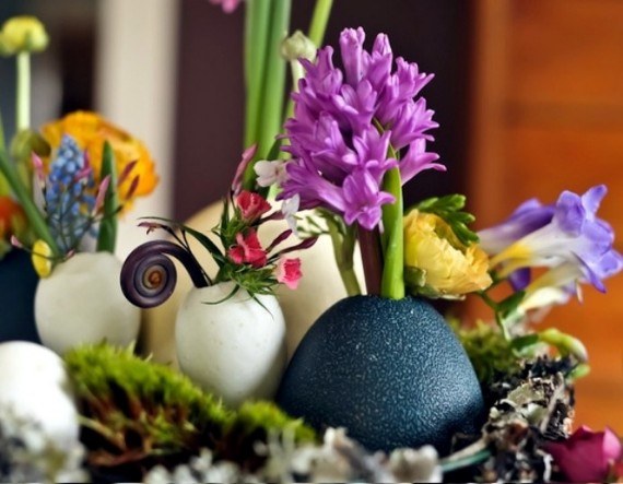 Empty egg shell decoration packaged with spring flowers are used as decorative Garlands and nests, floral table centerpieces and hanging decorations. Decorative vases are made of egg shell halves. White or brown egg shells are filled with a little bit of water then insert short steamed flowers in the eggshell to create small vases for flowers. Choose bright colored flowers to brighten up your Easter egg shell art. Put your charming egg shell flower vase as a table centerpieces and decorations for window.