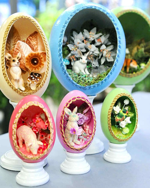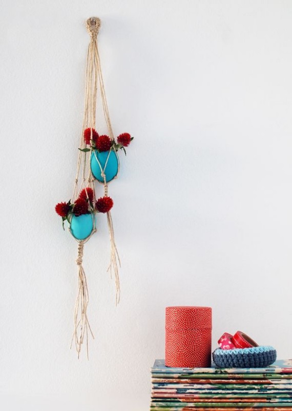 Egg shell vases or planters are lovely Easter display you can add additional beauty by making macramé holders for them. They add an elegant touch to your decor on the wall or scatter them around the house. Color the shells according to you home style so they will appear much fancier than they really are.