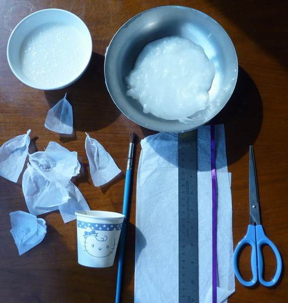 Glue, tissue paper, small plain paper cup, scissors, ruler, ribbon, a paintbrush.