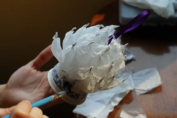 4-Turn the cup upside down (that will resemble the base of the attached petals), apply glue to the part of the cup on which the tissue paper will set on.